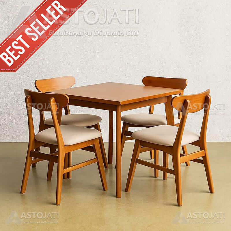 Jual Set Meja Cafe Ropan Minimalis 4 Kursi & 1 Meja Persegi Bahan 100% Kayu Jati Kombinasi Dudukan Jok | Kursi Paling Murah dan Terlaris.